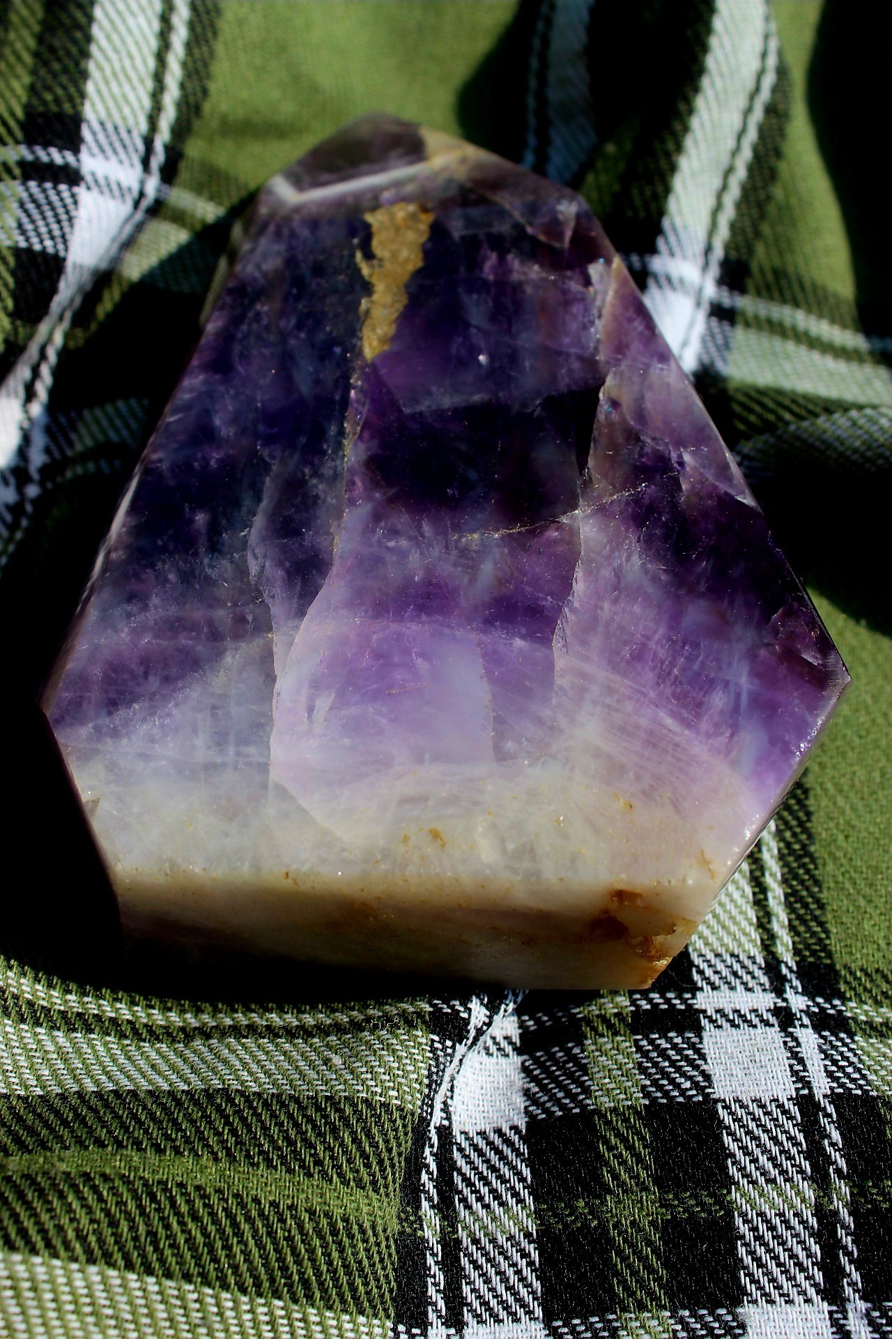 Chevron Amethyst Point – A stone of spiritual clarity and protection, Chevron Amethyst combines the calming energy of Amethyst with the strengthening qualities of White Quartz. It enhances intuition, deepens meditation, and shields against negativity. In point form, it directs energy upward, amplifying focus, healing, and divine connection.